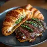 This Black Garlic Butter Steak & Brie Croissant Melt is the perfect main dish for a cozy night in or a casual get-together with friends. Serve it alongside a fresh green salad or roasted vegetables for a well-rounded meal. For a beverage pairing, a full-bodied red wine or a crisp, hoppy IPA would complement the rich flavors beautifully.