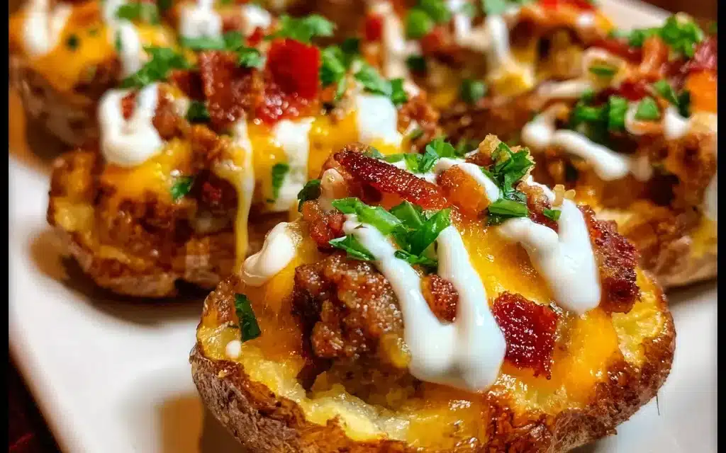 6- Arrange the potato skins on the prepared baking sheet. Spoon the Cajun beef mixture into the potato skins, then top with shredded cheddar cheese and crumbled bacon.
