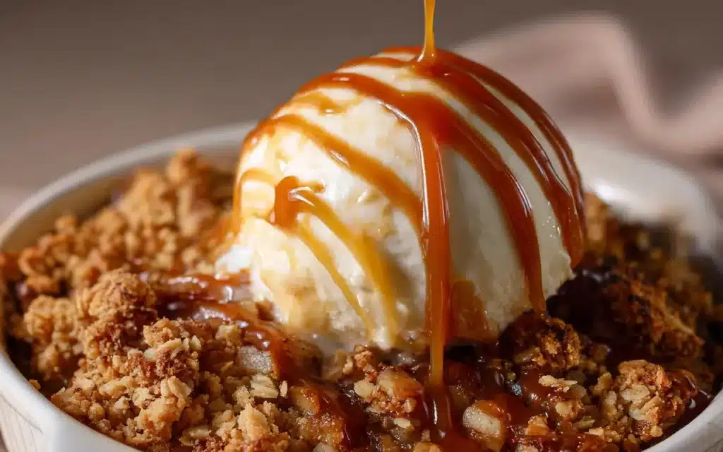 6- Let the crisp cool for 10-15 minutes, then drizzle the remaining caramel sauce over the top before serving.