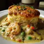 To make this Cheddar Bay Biscuit Seafood Pot Pie, you’ll need a mix of fresh seafood, like shrimp, scallops, and cod. Unsalted butter, all-purpose flour, and heavy cream create the rich, velvety sauce. Chicken or vegetable broth adds depth, while herbs like thyme, parsley, and bay leaves infuse the filling with aromatic flavor. For the biscuits, you’ll use buttermilk, shredded cheddar cheese, and a blend of baking powder, baking soda, and salt. Don’t forget the paprika and cayenne for a hint of smoky, spicy goodness.
