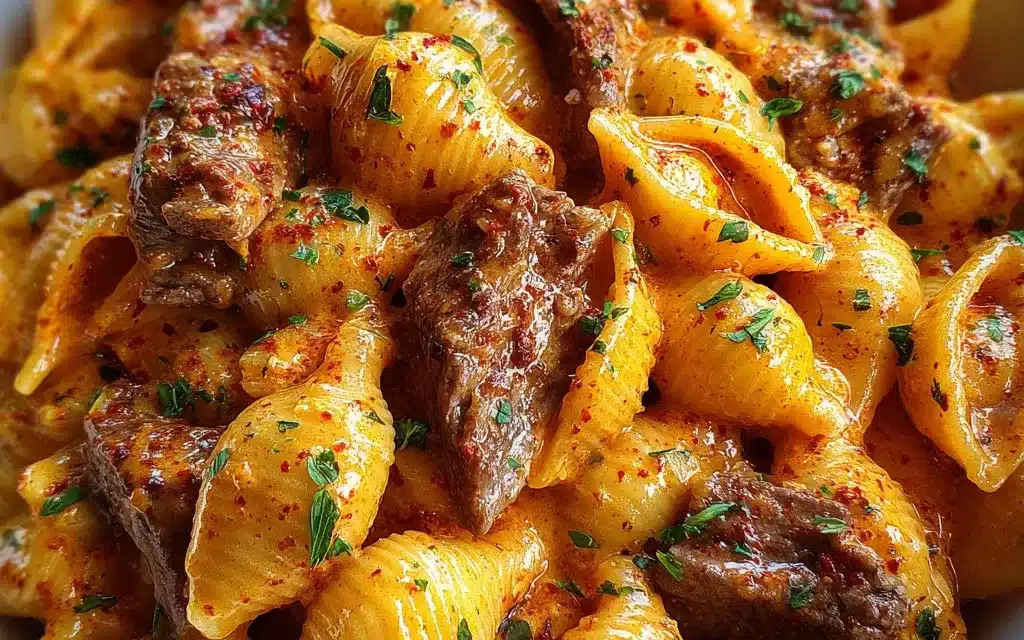 6- Serve the Creamy Paprika Steak Shells hot, garnished with a sprinkle of extra paprika and chopped parsley, if desired.