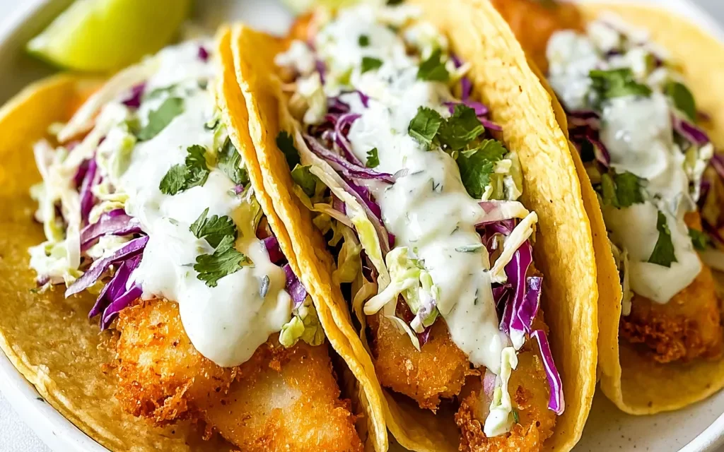 Crispy, golden-brown beer-battered fish tacos are a flavor-packed seafood delight. Tender, flaky white fish is coated in a crisp, bubbly batter made with beer, then topped with fresh cabbage, pico de gallo, and a creamy sauce for a mouthwatering meal.