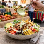 What sets this Farmer’s Market Chicken Taco Salad apart is the perfect balance of fresh, seasonal ingredients and bold, authentic flavors. By sourcing the best produce from the farmer’s market, you’re ensuring that every bite is bursting with the pure essence of summer. The combination of juicy grilled chicken, crisp romaine, and a medley of toppings like avocado, black beans, and tangy lime dressing creates a symphony of textures and tastes that will have you coming back for more.