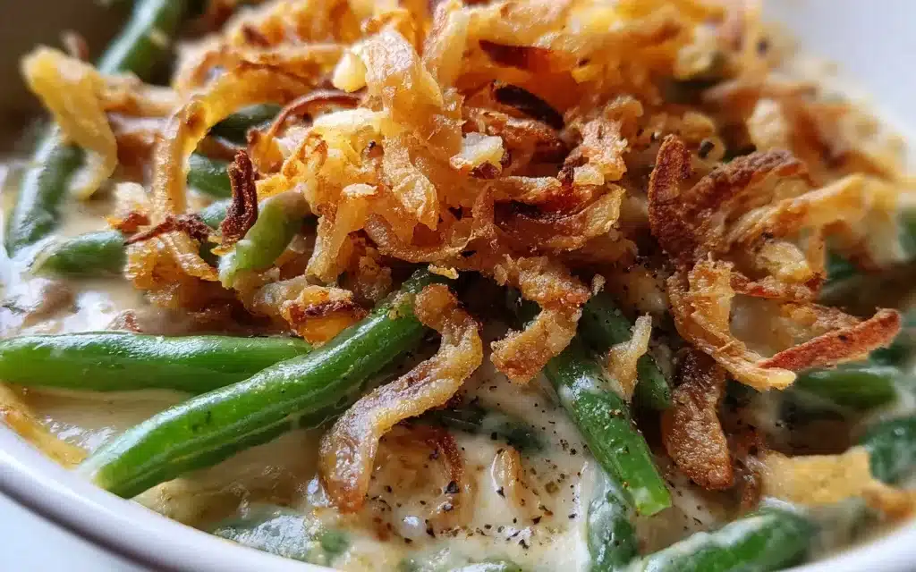 A classic, comforting Greenbean Casserole featuring tender green beans in a rich, creamy mushroom sauce, topped with crispy fried onions for the ultimate side dish.