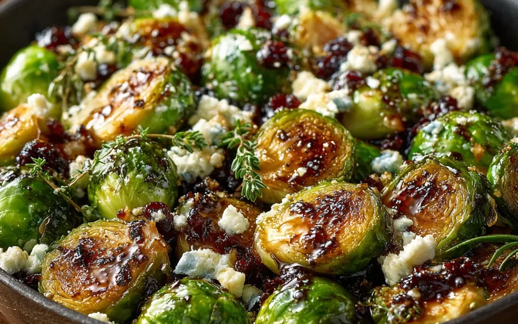 6- Remove the roasted Brussels sprouts from the oven and drizzle the honey-balsamic glaze over the top, tossing gently to coat. Serve immediately, garnished with a sprinkle of fresh thyme or parsley, if desired.