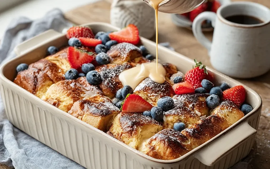 6- Serve the Overnight French Toast Casserole warm, garnished with a dusting of powdered sugar, a drizzle of maple syrup, or your favorite fresh fruit. Indulge in the heavenly combination of crisp edges and creamy, custard-like interior.