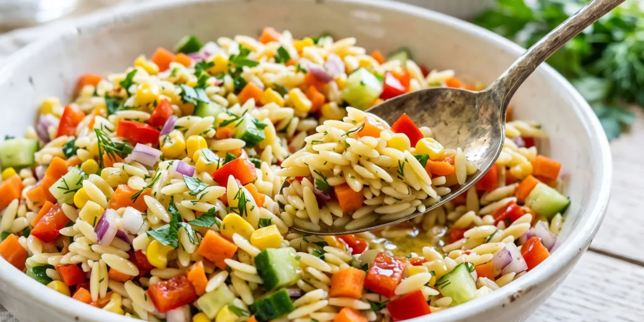 4. Pour the dressing over the orzo salad and toss to coat evenly.