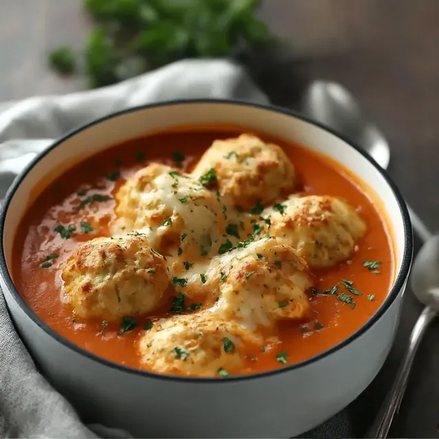 6. Serve the Tomato Soup & Cheesy Herbed Dumplings hot, garnished with extra parsley if desired.